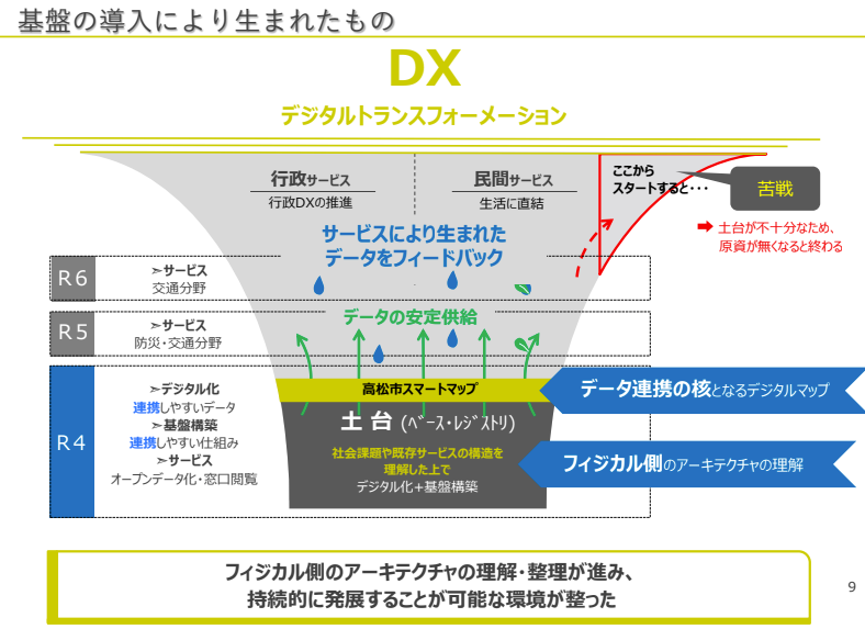 高松市では、インフラ台帳を管理する地理空間データ基盤を「土台」とし、この基盤上に「業務アプリケーション」と「新しい市民サービス」を構築しています。サービスからではなく、土台であるベースレジストリの業務改善から着手しており、基盤で台帳を管理する部分だけとっても、以前よりコストカットできているから、データが安定供給されることにつながります。今後も、地域課題の解決に向けて、民間の領域も含めたバックヤード側のさらなる業務のBPRを進めるとともに、社会構造を無理なく変えていく制度設計を行う中で、地理空間データ基盤を活用し、民間事業者も含めた多分野のデータ連携によるユースケースを段階的に拡充させ、官民連携による持続可能な都市経営に資する、まちづくりに取り組んでいきます。