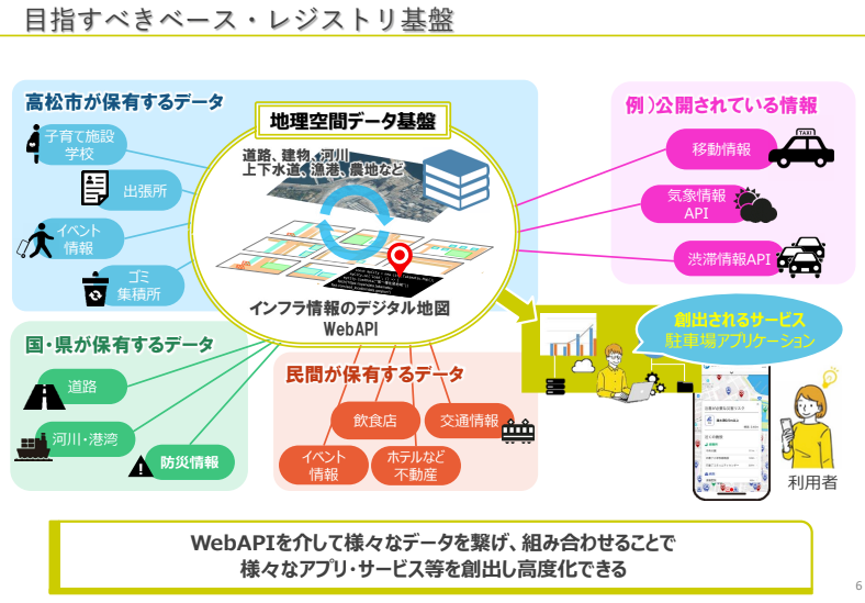 高松市では、先行して都市OS FIWAREを導入し、防災分野でのシステムを一つ構築したものの、その後の他の部署の業務への展開が難しく、分野間連携が起きていないという課題がありました。 1つのデータが入ると、様々なデータやサービスがつながるのが理想です。このようなコネクトしやすいデータが入っていないことがスマートシティが進んでいない要因であると考えました。そこでコネクトしやすいデータとして着目したのが、移動データ、地図(位置情報)、決済情報です。とりわけ地図は、行政手続きの中で多く使われており、サービスを提供する時に、インターフェイスに地図があるのは使いやすく、コネクトしやすいデータであると考え、インフラ台帳を基軸とした地図、つまり自治体版ベースレジストリから着手しました。