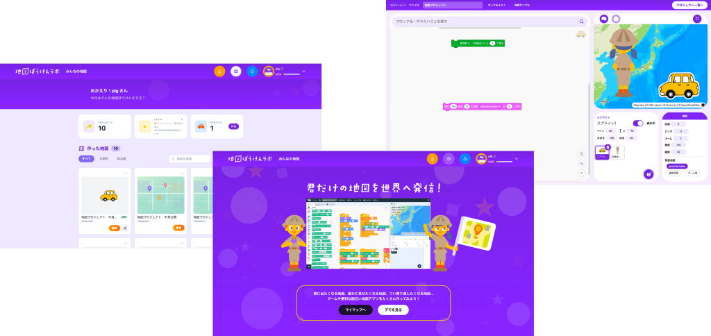 - 地図作品を簡単に作成・公開 :地図上にキャラクター(スプライト)やオブジェクトを配置し、Scratchベースのブロックプログラミングで地図作品を作成。作った作品は「みんなの地図」として公開・共有でき、他のユーザーの作品を見て学ぶこともできます。