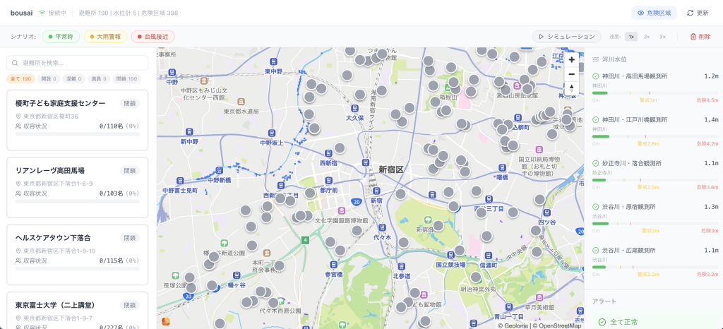 本日より、防災シナリオを題材にしたデモ環境の提供を開始いたします。避難所190件・水位計5・危険区域398を地図上に統合表示し、平常時から大雨警報・台風接近までのシナリオ切り替えをリアルタイムでご確認いただけます。